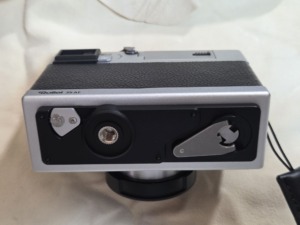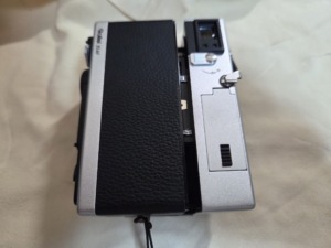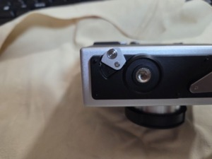 左側の小さい銀色のやつが底蓋を止めているものとなります。右側に見えるのは、巻き戻しクランクとなり、フイルムが撮り終わったら、ファインダー横にあるRのところを動かし、クランクを回します。