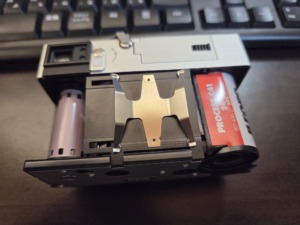底蓋と裏側のボディ部分まで外してフイルムを装填する場所が見えるようになります。少し押さえ込みつつ引く抜くと、カポッと外れます。