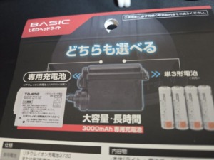専用充電池が付いているので長時間使用することも可能で、万が一家に忘れたり、充電されていなくても単三電池4本で使用することもできる。照射時間は8時間で、50lm,250lm,500lmの三段階切替。