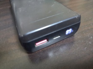 ゲオで買ったモバイルバッテリーはスマートフォン3回分充電ができる。USB-A1ポート、Type-C1ポートで同時充電することができ、飛行機内に持ち込むことができます。残量がパーセント表示されるので、これぐらいしか残ってないなってわかります。