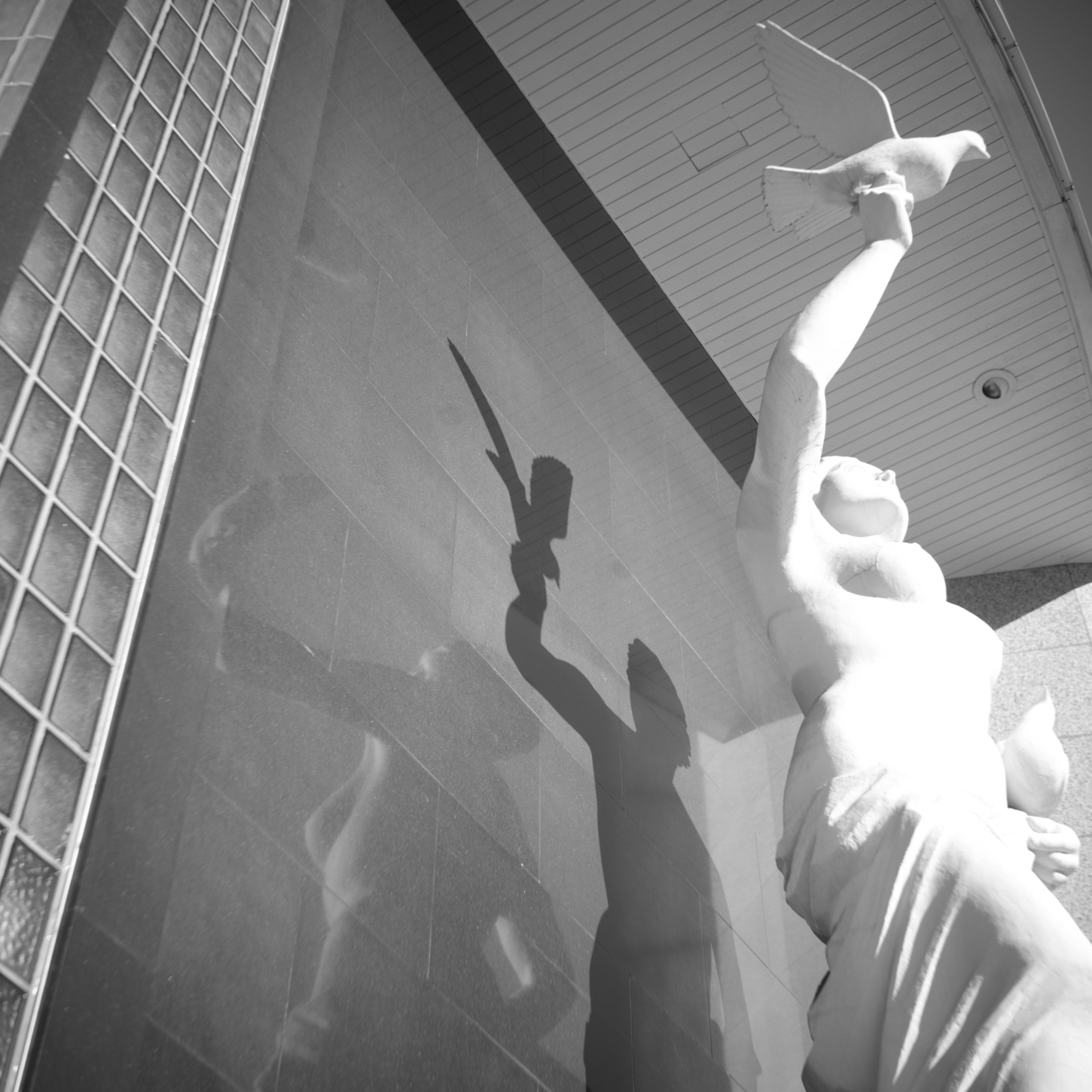 また、彫像の滑らかな質感と、壁のタイル状の硬質な質感がぶつかり合い、写真全体にリズムを生み出している。モノクロだからこそ光と影の境界が強調され、視覚的なインパクトが増しているのも特徴だ。静止しているはずの彫像が、今まさに鳥を空へ解き放とうと動き出す瞬間を捉えたような、不思議な躍動感がある。見れば見るほど想像が広がる、そんな一枚になった。