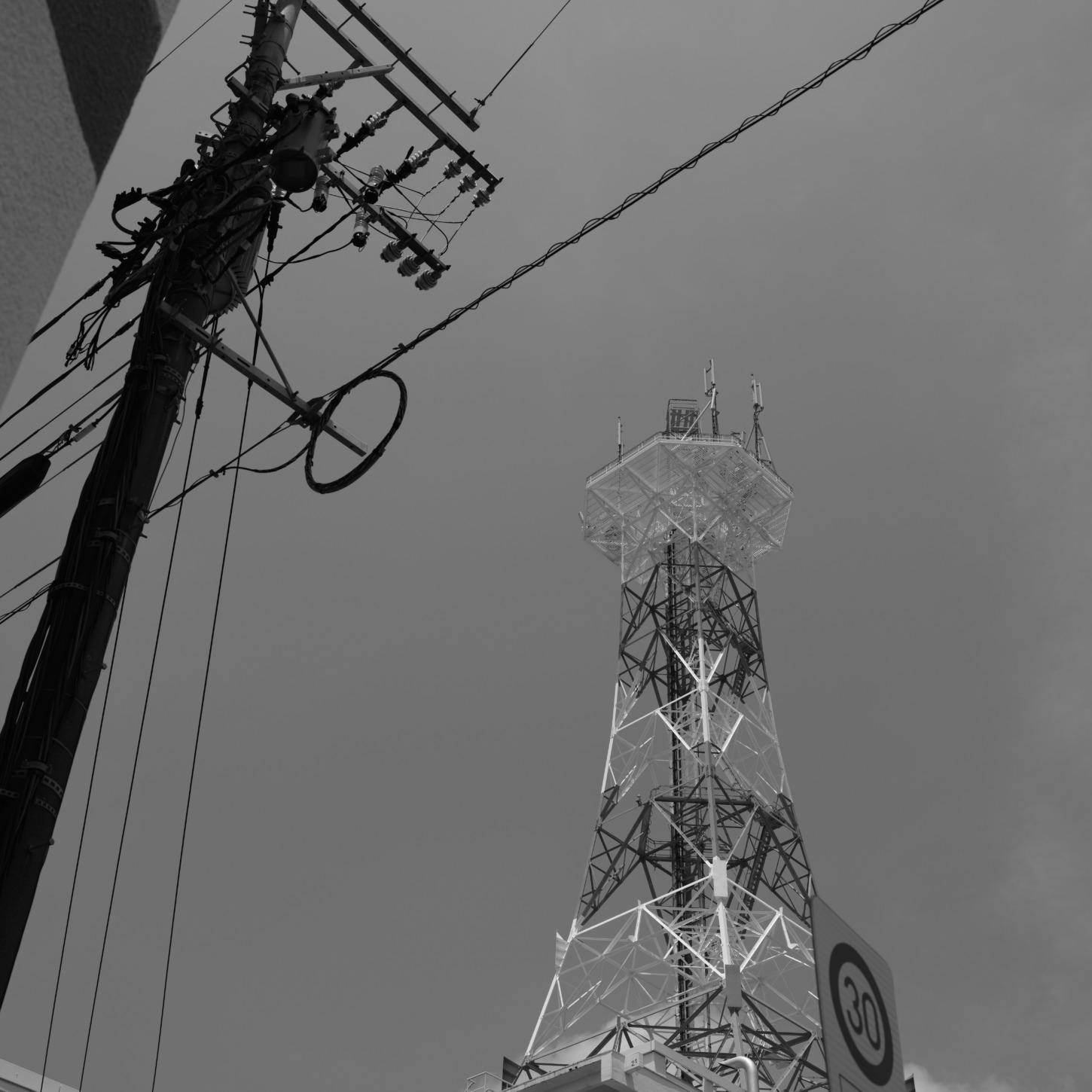 特にモノクロで撮影したことで、光が当たった鉄塔の金属部分が白く浮かび上がり、影となった部分とのコントラストがより強調されている。電柱の重厚さと鉄塔の軽やかな格子構造が、互いを引き立てながら画面の中で独自のリズムを奏でているのも印象的だ。空を切り裂くように高く伸びる鉄塔は、どこか未来的でありながらも、この街の長い歴史の中に静かに存在してきた時間を感じさせる。