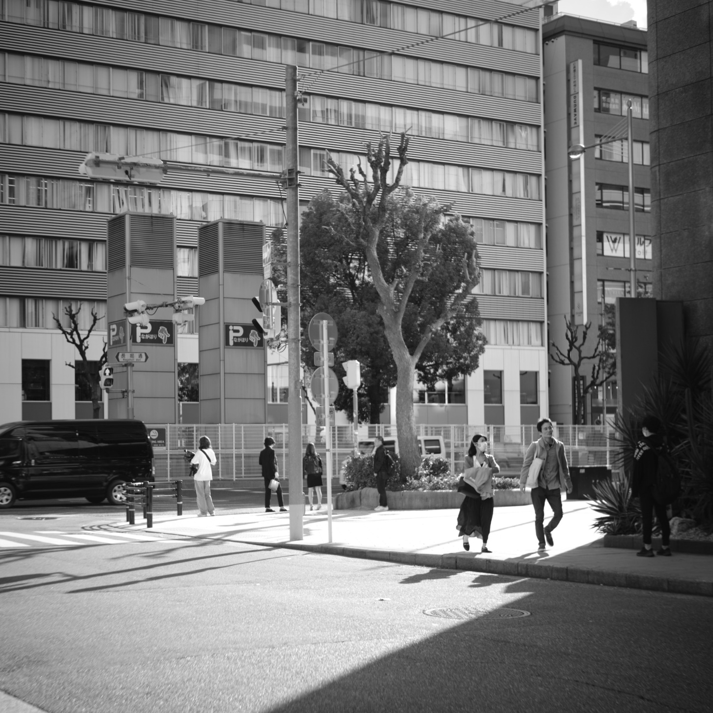 心斎橋近くにある商業ビルから、交差点の上を見下ろすように撮影しました。人や車が行き交う喧騒の中で、ふと高所から眺めると、街全体がひとつの大きな構造物のように見えてきます。規則正しく並ぶ道路の線、建物の影、そして光の反射がつくるリズム。そのすべてがモノクロの世界では形とトーンの対話として現れ、都市の秩序と混沌を同時に感じさせます。モノトーンだからこそ、光が描く輪郭やコントラストが際立ち、街が持つ静かな緊張感を浮かび上がらせます。普段は通り過ぎるだけの場所も、視点を変えることで新しい表情を見せてくれる――そんな瞬間を切り取った一枚です。