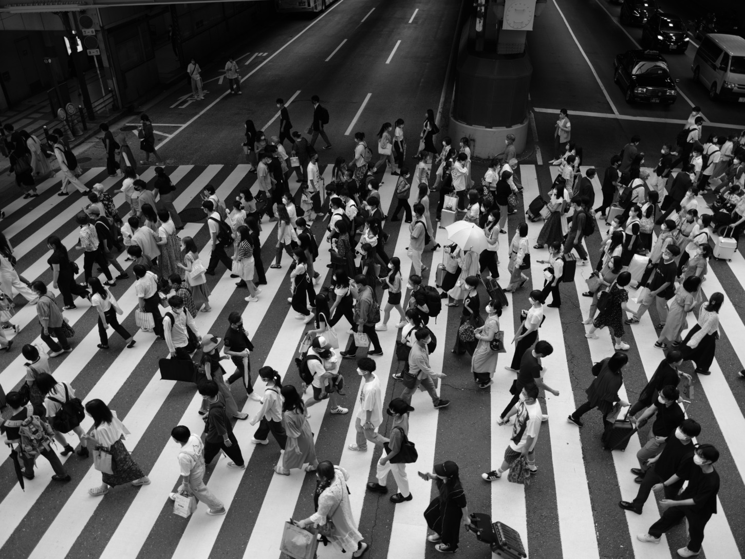 大阪の大動脈・梅田交差点|横断歩道の躍動感あふれる瞬間