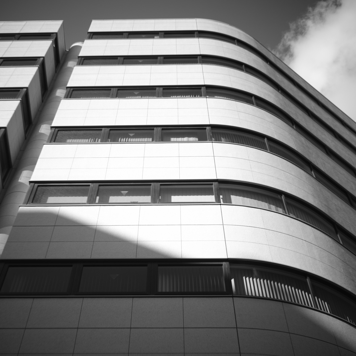 モノクロームのトーンは、パネルの滑らかな質感と、窓ガラスの暗い反射を際立たせ、この建築が持つクールで洗練された雰囲気を高めています。窓の帯は、この巨大な構造体が、人々が働く知的活動の舞台であることを示唆しています。