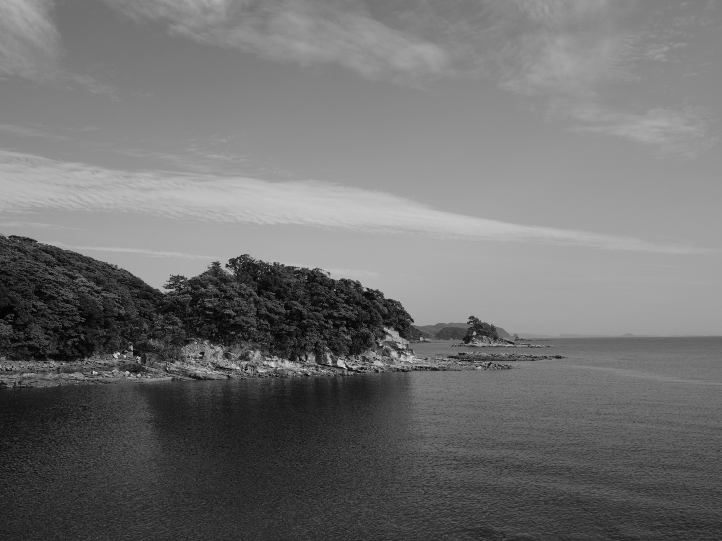 画面いっぱいに広がるのは、豊かな緑に覆われた島々の姿と、静かに広がる穏やかな海です。都会のビル群のような直線的な人工物はなく、ただ自然の造形が持つ緩やかな曲線と、波の音だけが支配する場所です。力強い太陽の光が、島々の木々や岩肌を立体的に照らし出し、モノクロームでありながら生命感に満ちています。