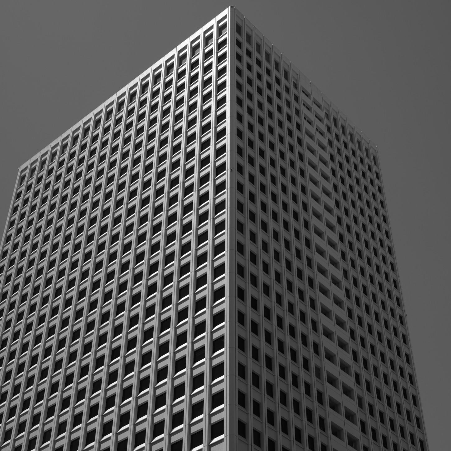 モノクロームにすることで、建物を構成する**「線」と「面」の美しさが際立っています。窓一つひとつの格子が作り出す壮大なパターンは、計算し尽くされた機能的な美**を雄弁に物語っています。建物を覆う光と影のグラデーションが、この巨大な構造体に深い奥行きと存在感を与えています。